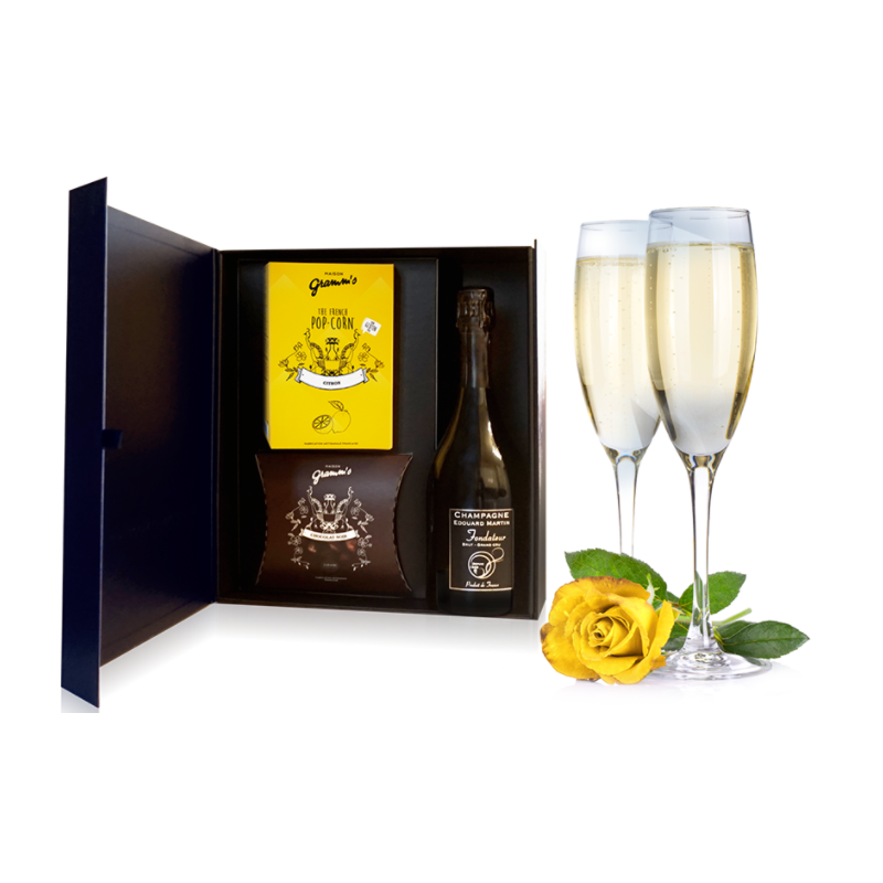 Robe or clair et fines bulles ! Le champagne Grand Cru de la Maison Edouard Martin, aux parfums de fruits secs, se marie parfaitement avec les notes d’agrumes et les notes boisées de nos pop-corn au citron et au chocolat noir de Sao Tomé.